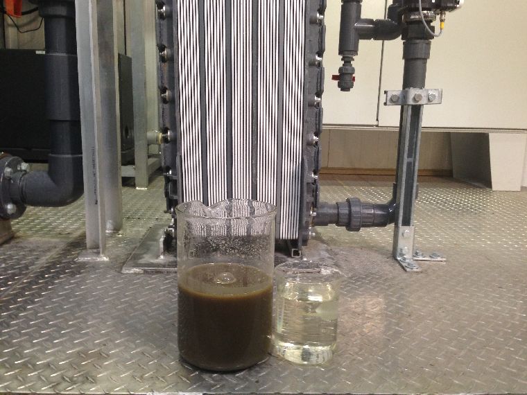The company has developed a waste water plant that takes up a small footprint and can be shipped to various locations. Once connected, the waste water is fed into the system. But first, the solids have to be separated.