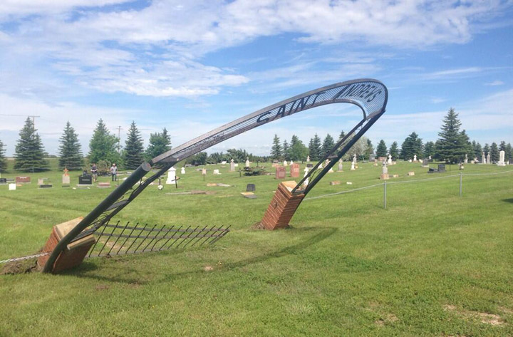 One of the tornadoes left a path of destruction at the cemetery in Kenaston, Sask. Trees were uprooted and many were snapped in half and flung across gravestones.