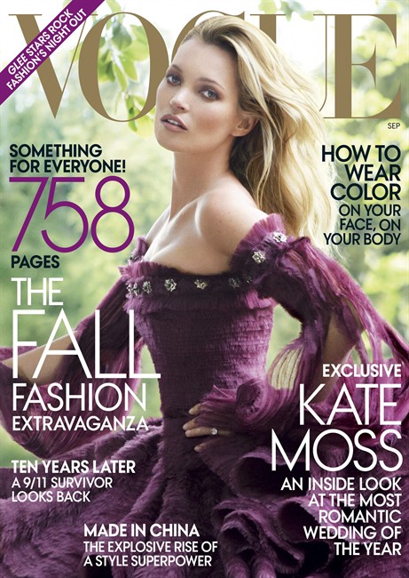 The September issue of Vogue magazine goes inside the supermodel’s July wedding to musician Jamie Hince. Moss says she was charmed by the extravagance of gypsy weddings with wedding gowns that are like “blinging butterflies times ten.”