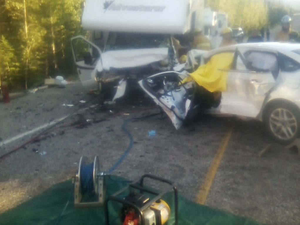 “What we know at this point is the car that was travelling southbound carrying three people collided head-on with a northbound motorhome,” said RCMP Cpl. Carol McKinley.