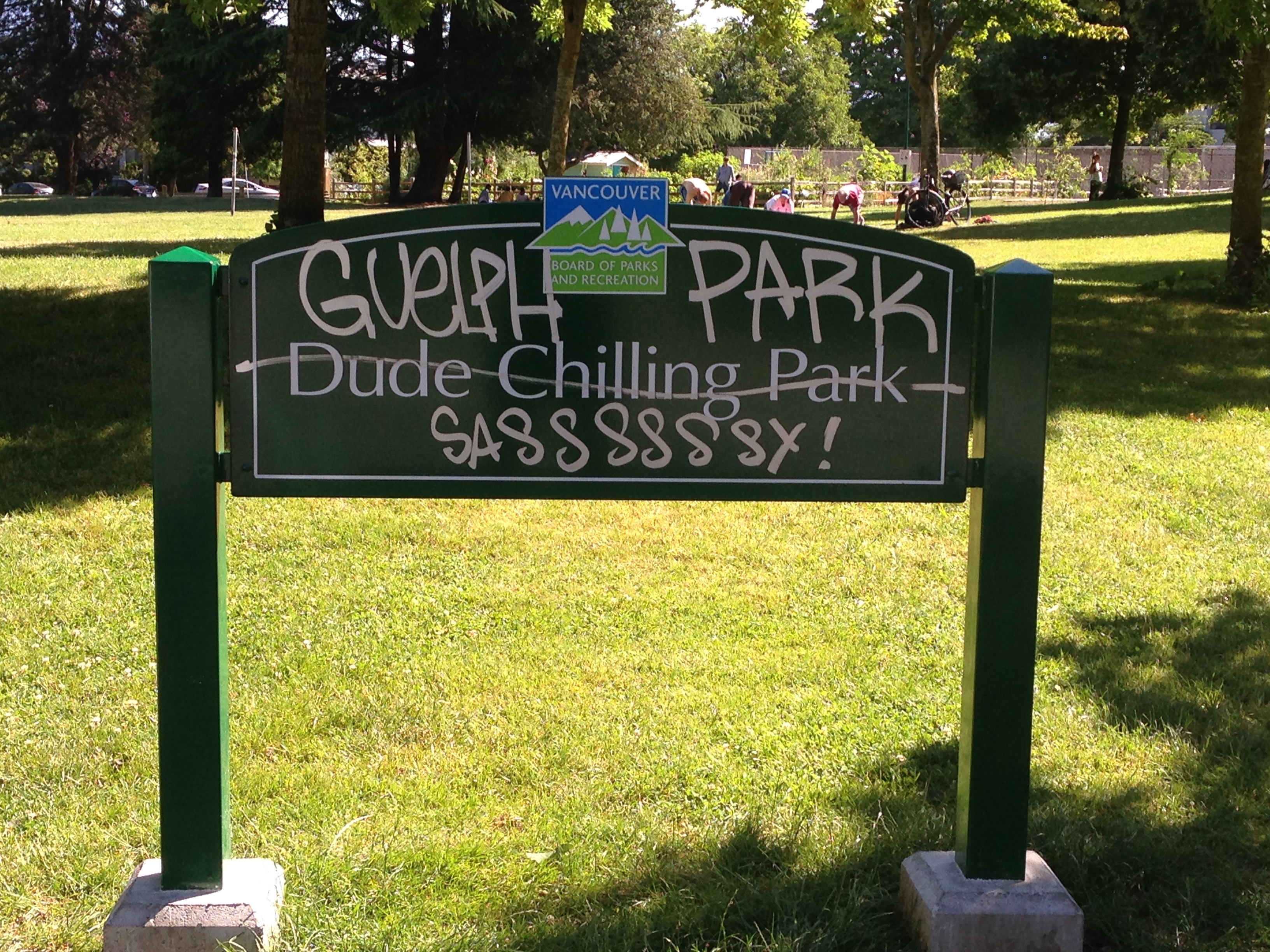 The “Dude Chilling Park” sign at Guelph Park on 8th Avenue and Guelph St. has been vandalized.