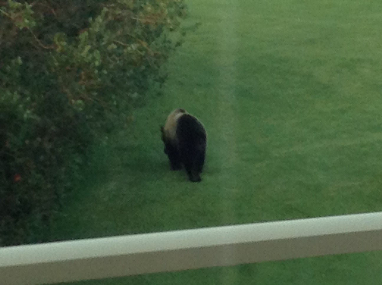 Janelle Donaldson was just about to leave her Bearspaw home to go for an early morning run, when she was spotted the adult bear sitting in her backyard.