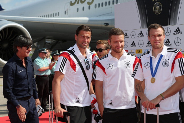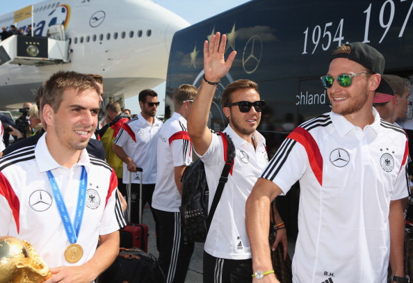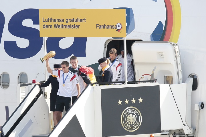 Captain Philipp Lahm led the team off the aircraft with the trophy held aloft, to cheers and a chorus of “Football’s Coming Home” from fans on the airport’s viewing terrace.