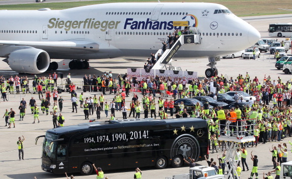 From the airport, the team set off for downtown Berlin in a bus painted with the years of Germany’s World Cup victories: The previous occasions were in 1954, 1974 and 1990.