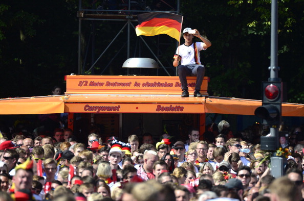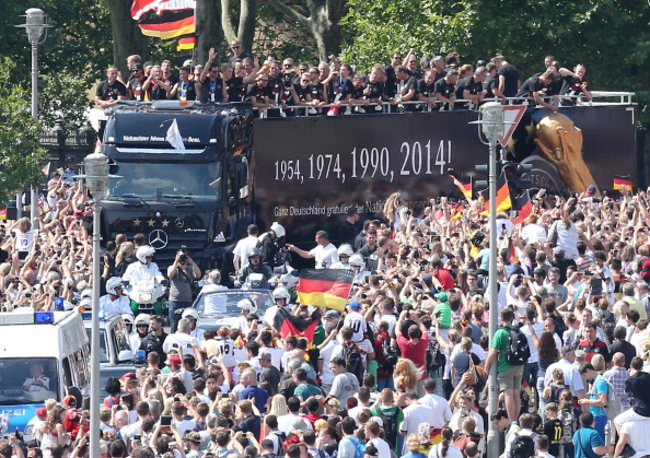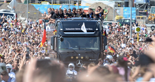 The team climbed aboard an open-top truck for the last part of the trip to the Brandenburg Gate, inching its way forward through cheering crowds.