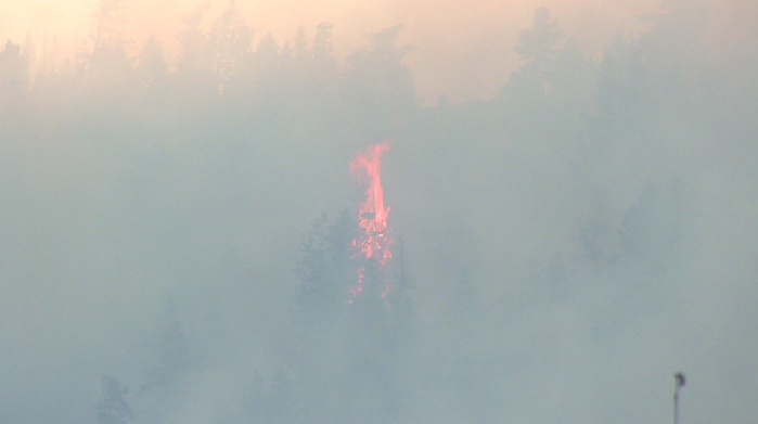 The flames are highly visible with some trees candling.
