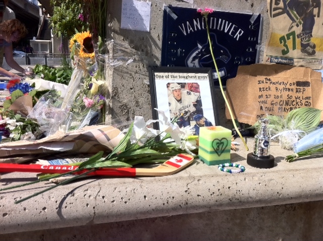 A miniature hockey stick, a teddy bear, a Stanley Cup replica and a Canadian flag covered with words of condolence for the Rypien family were just some of the things people left at the makeshift memorial set up near the Roger Neilson statue in front of Rogers Arena, where Rypien played many a game for the Vancouver Canucks in his six seasons with the team.