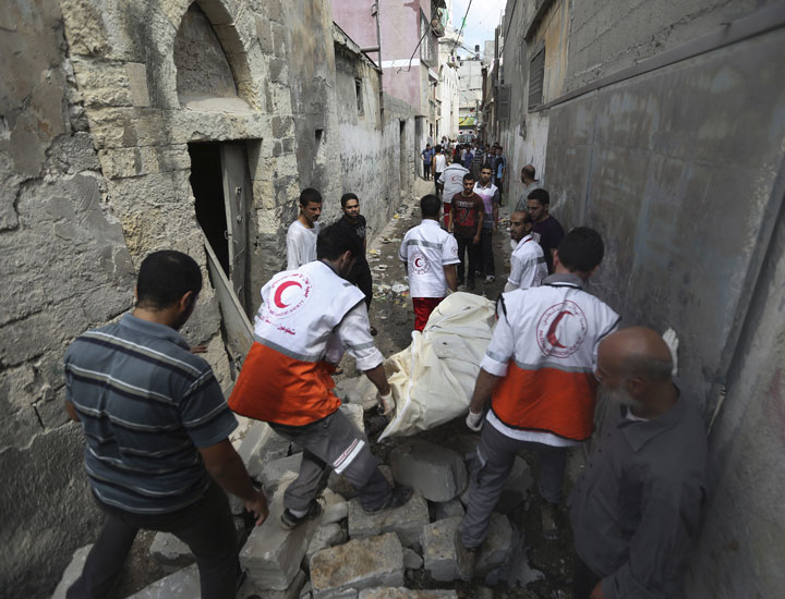 During a brief Red Cross-brokered lull later in the day, rescue workers toured the neighbourhood to retrieve the dead, pulling bodies from the rubble of homes.