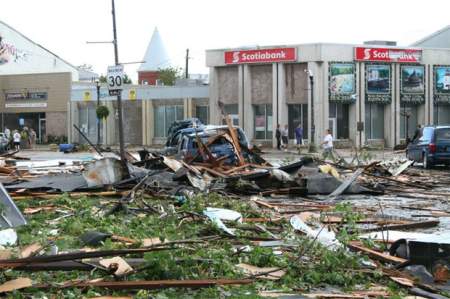 Radio station CKNX reported that downtown businesses, century old buildings and several churches lost their roofs and upper floors.