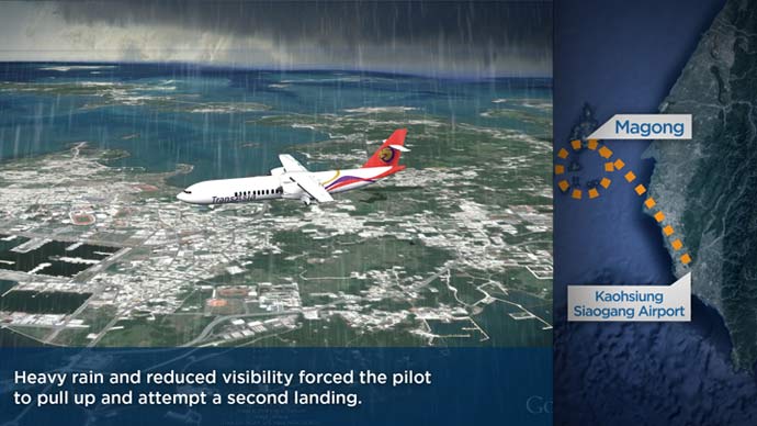 The Central News Agency, citing the county fire department, said it appeared heavy rain reduced visibility and the pilot was forced to pull up and make the second landing attempt.