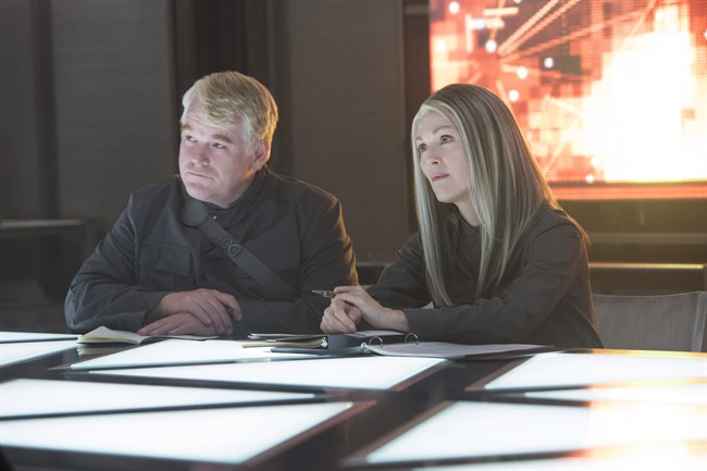 It shows the late Philip Seymour Hoffman as Plutarch Heavensbee telling District 13 leader Alma Coin (Julianne Moore) that Katniss Everdeen (Jennifer Lawrence) is worthy of uniting the districts.