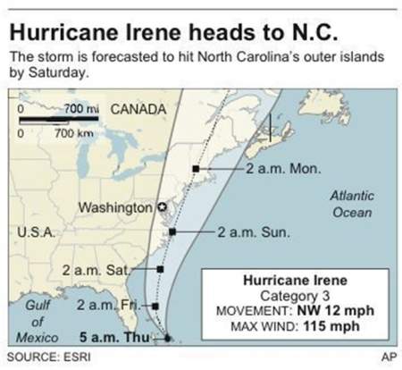 Forecasters say that Irene could hit North Carolina’s Outer Banks on Saturday afternoon.