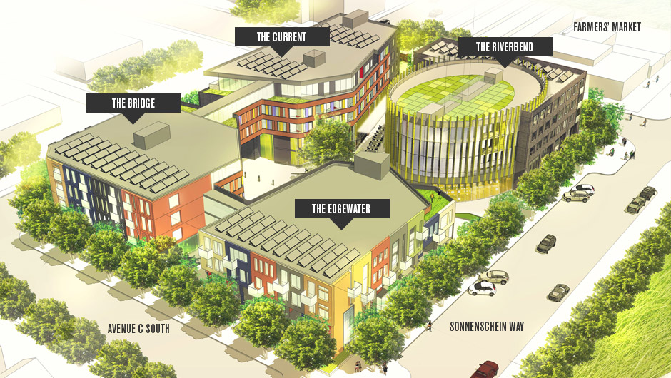 The project consists of four buildings, The Riverbend, The Edgewater, The Bridge and The Current. The buildings will go up simultaneously and are expected to be complete within 20 months.