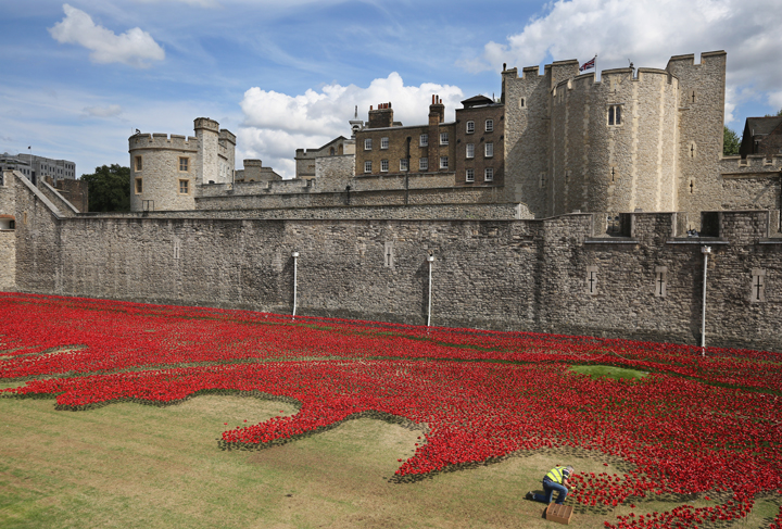 LONDON – A blood-red sea of ceramic poppies is spilling from the Tower of London to commemorate British and Commonwealth soldiers killed in World War I on the 100th anniversary of its start.