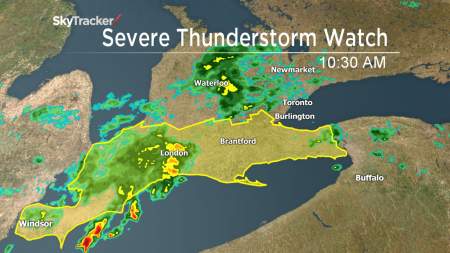 Environment Canada issued a severe thunderstorm watch for the following regions early Tuesday morning: