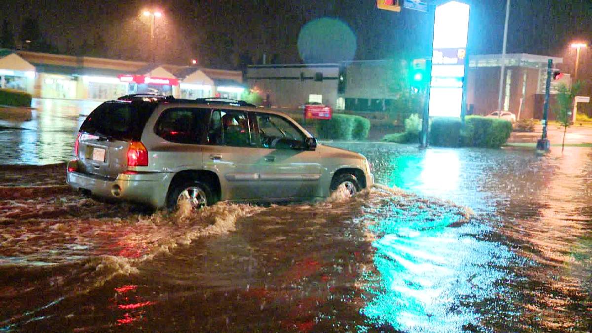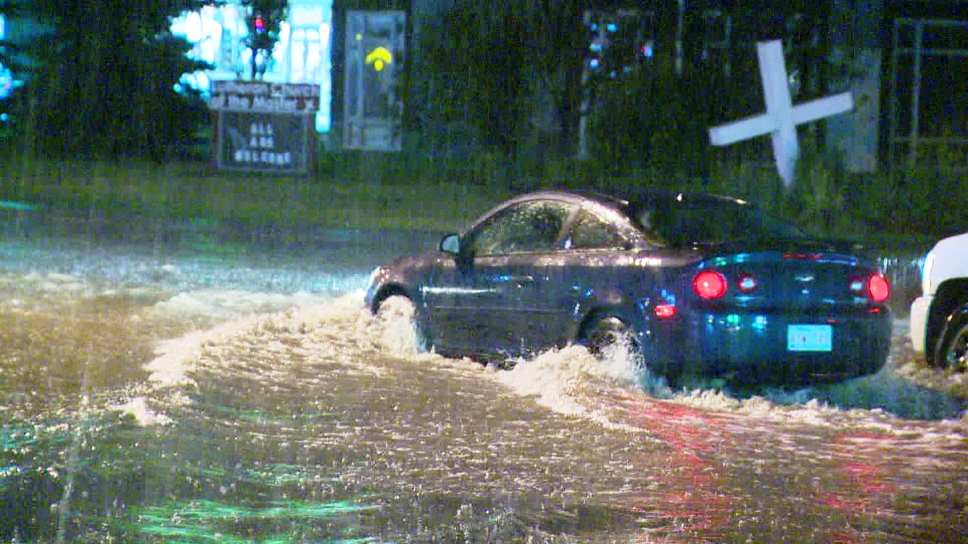The first storm struck around 4 p.m., one hour after Environment Canada issued a severe thunderstorm warning for the area. It sent toonie-size hail pounding down onto city streets.