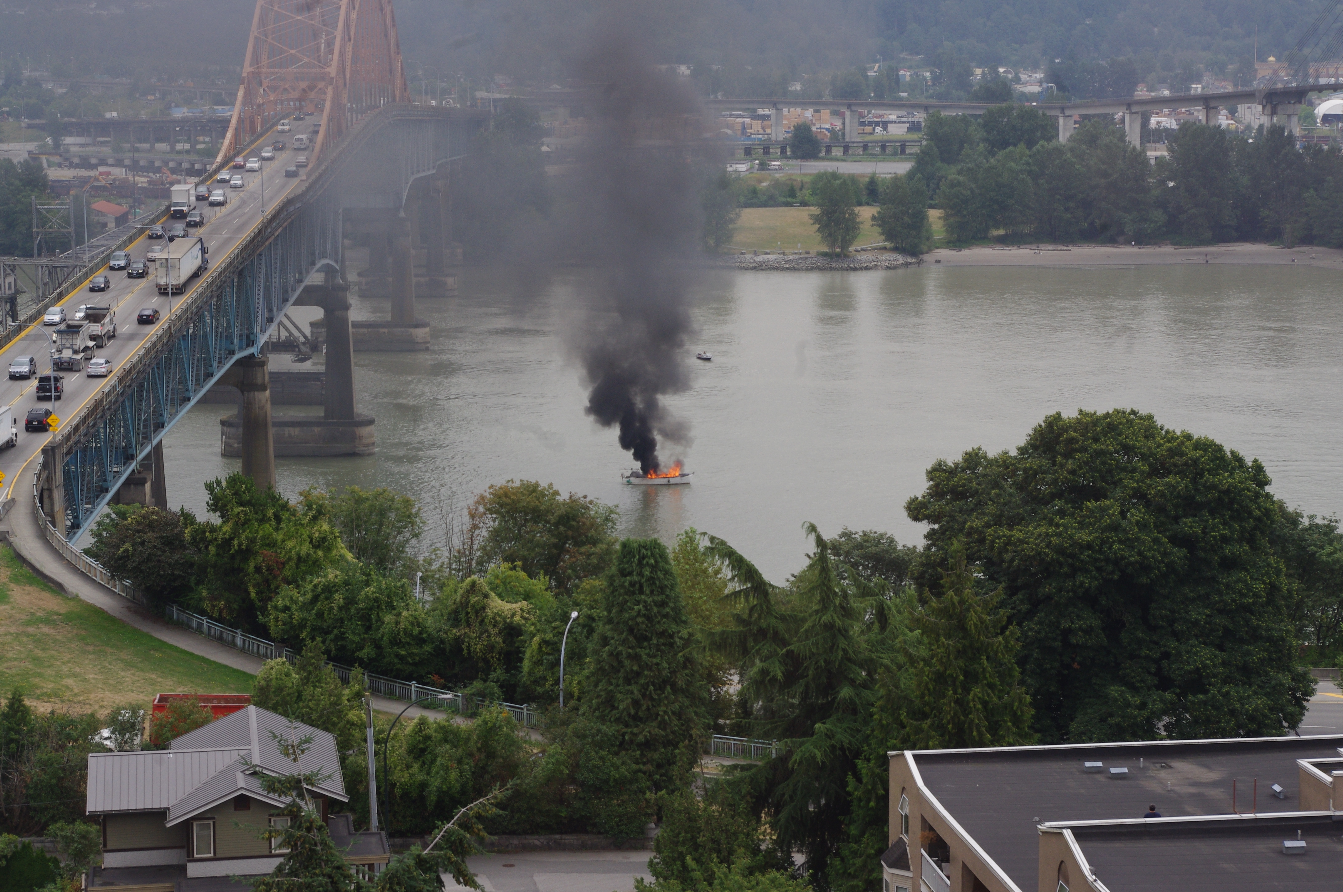 A fishing vessel with three people on board caught fire on the Fraser River near the Pattullo Bridge this morning.