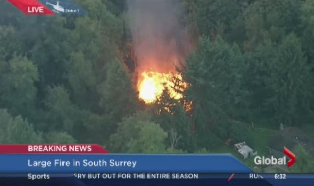 A two-storey, wood-framed abandoned home was burning in a wooded area around 16th Avenue and 176 Street near several homes.