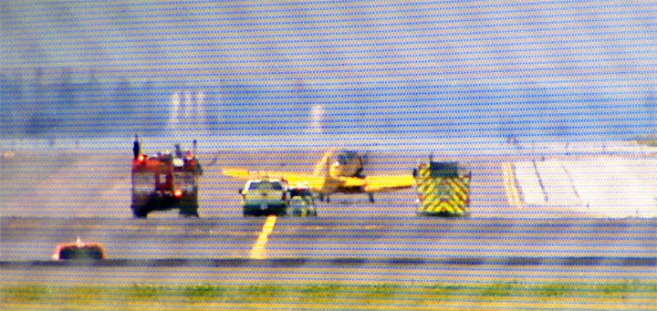 Police say the landing gear collapsed upon landing at the airport. Before landing, the plane had been flying as part of a practice run for this weekend’s air show.