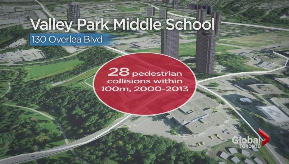 Valley Park Middle School, near Don Mills Road and Overlea Boulevard, ranks worst, with 28 pedestrian-vehicle collisions. That’s an average of more than two accidents per year.