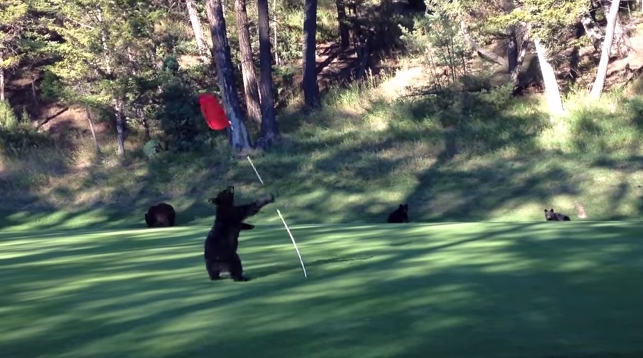 The bear started dancing and playing with the flagstick while some other bears in the background looked on.