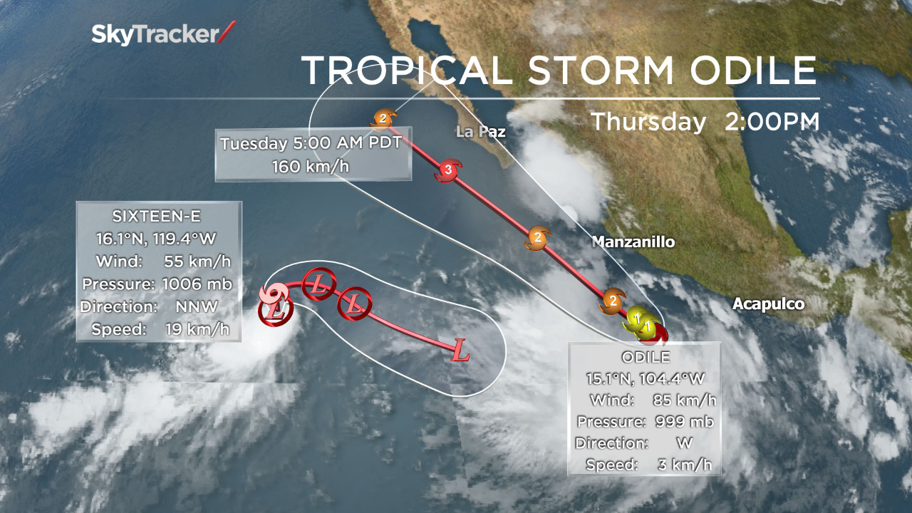 Odile is moving westward at 4 km/h and is expected to remain on that track until Friday. Maximum sustained winds are 85 km/h with higher gusts.