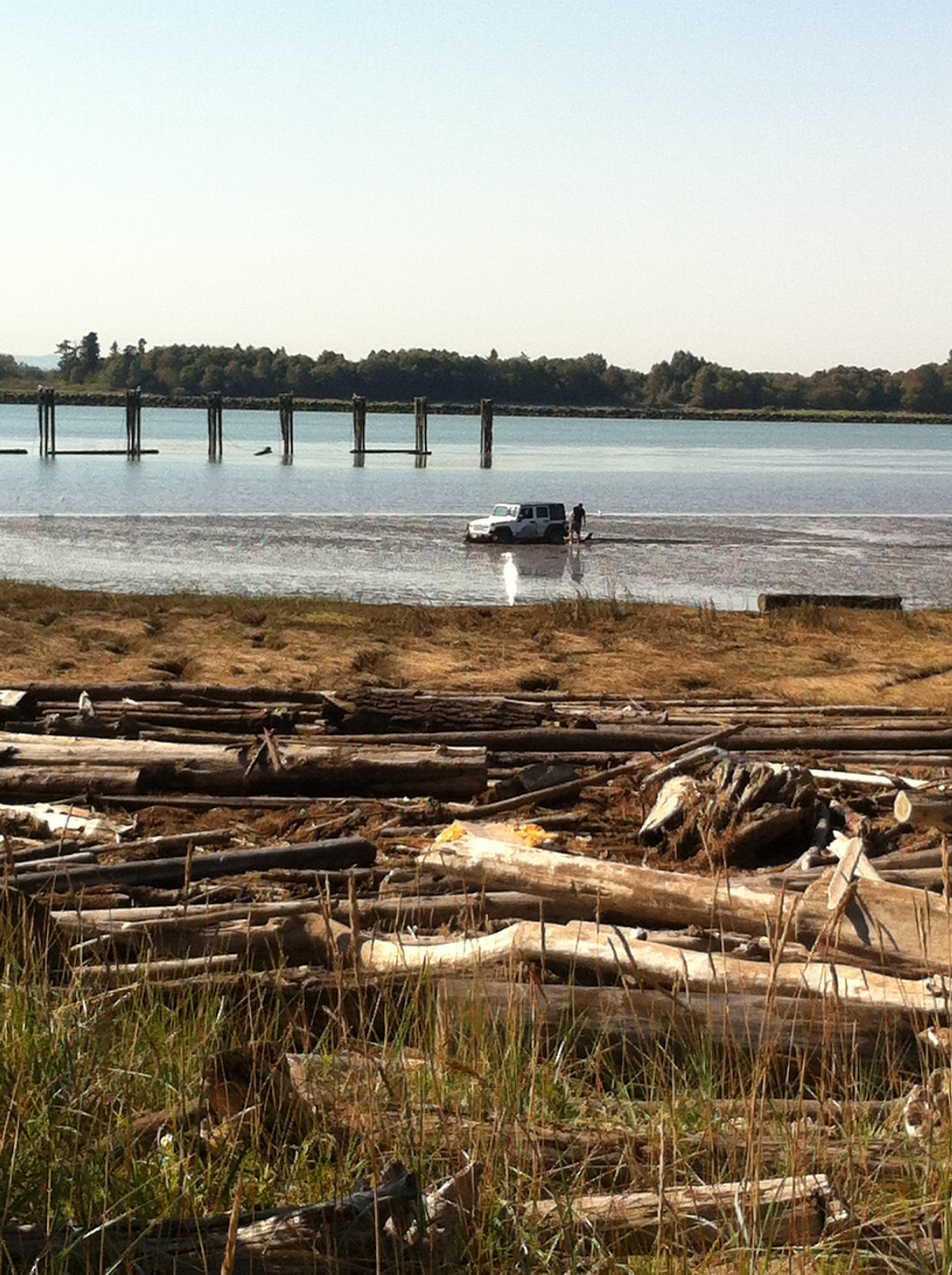The tide was already on its way in and despite their best efforts, the occupants had to retreat to shore and the Jeep, reportedly with Washington State plates, was left to the rising water.
