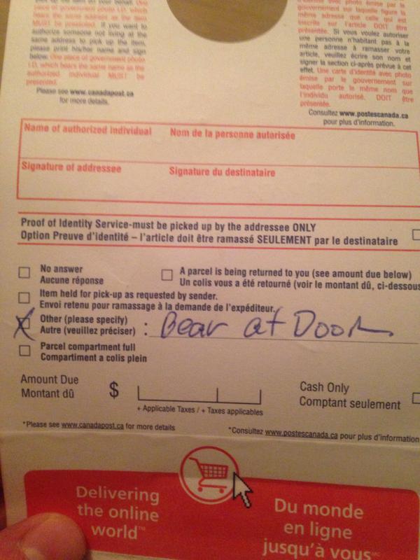 But, Coquitlam resident Matthew Fane says he was more amused than surprised when he received a delivery notice from Canada Post saying his package was not delivered because of ‘bear at the door.’