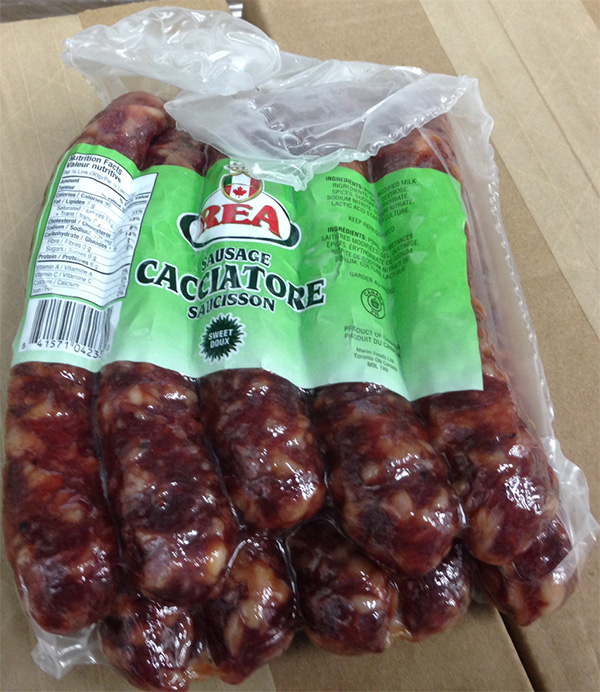 The recall covers four sausage products are in various packages under the REA Sweet Cacciatore name and three others under the label Bona Sweet Cacciatore.