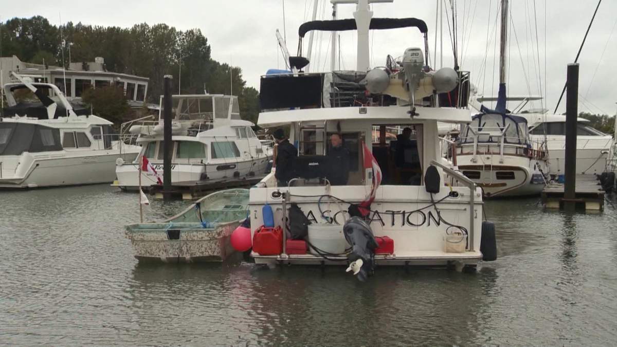 Danielle Duncan and her father, Captain Harold Duncan, towed in a small boat they found washed up on the southwest side of Dewdney Island, off British Columbia’s north coast.