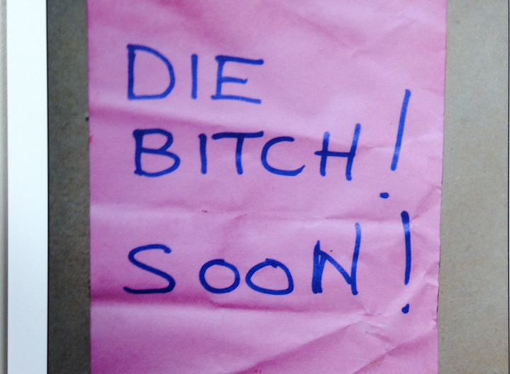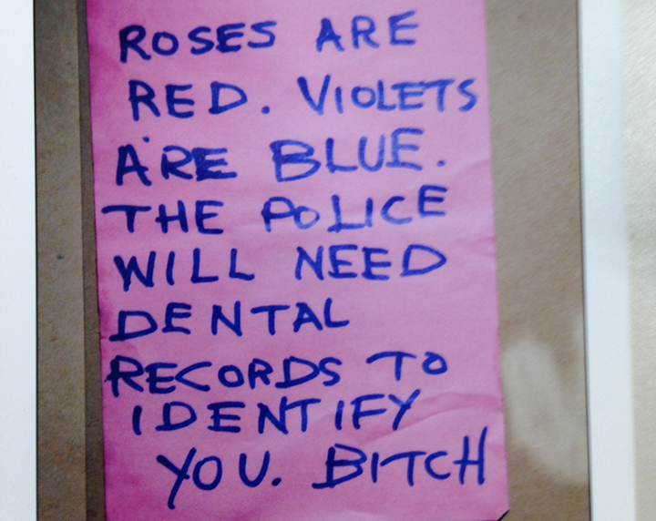 The blood-stained parcels sent to the Vancouver schools also contained pink gift-style tissue paper and notes written on the same sort of purple paper. “Die b****! Soon!” read one. “Roses are red. Violets are blue. The police will need dental records to identify you. B****,” the other read.