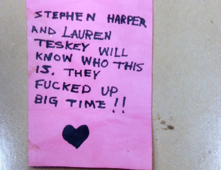 “Stephen Harper and Lauren (sic) Teskey will know who this is. They f***** up big time,” read one note, with a black heart coloured in at the bottom.
