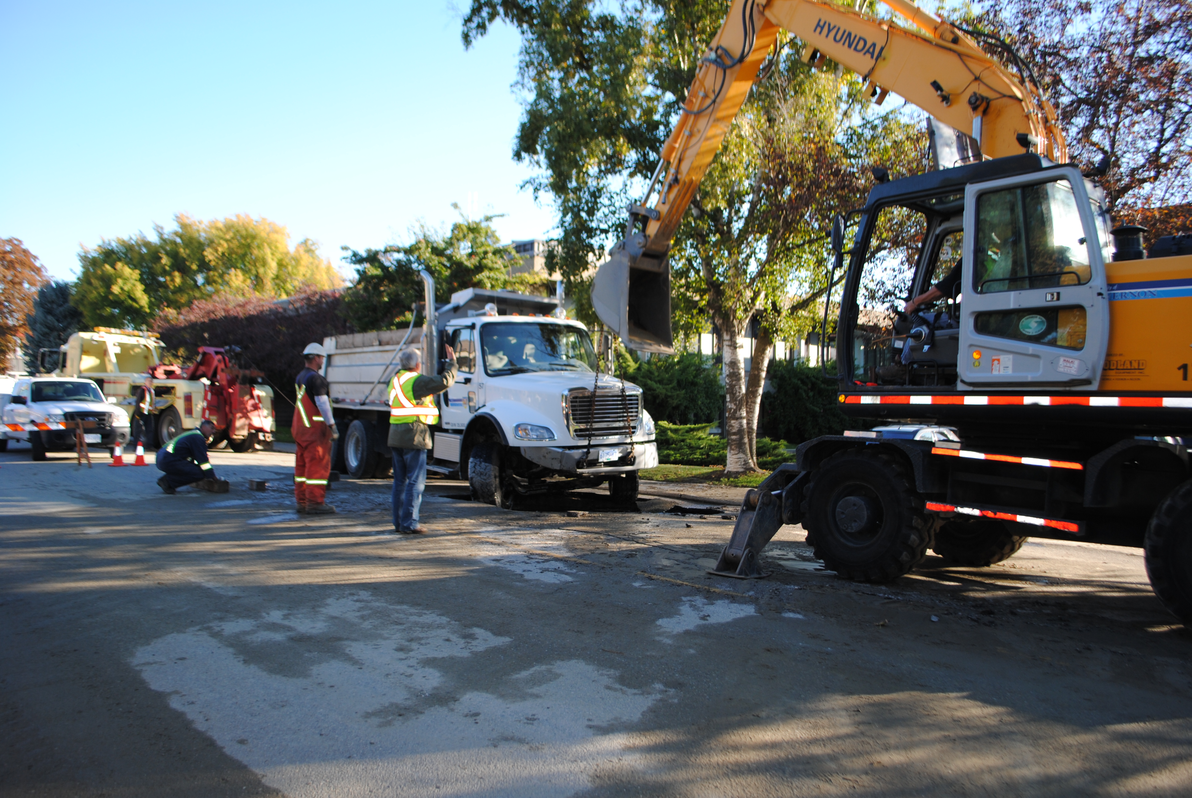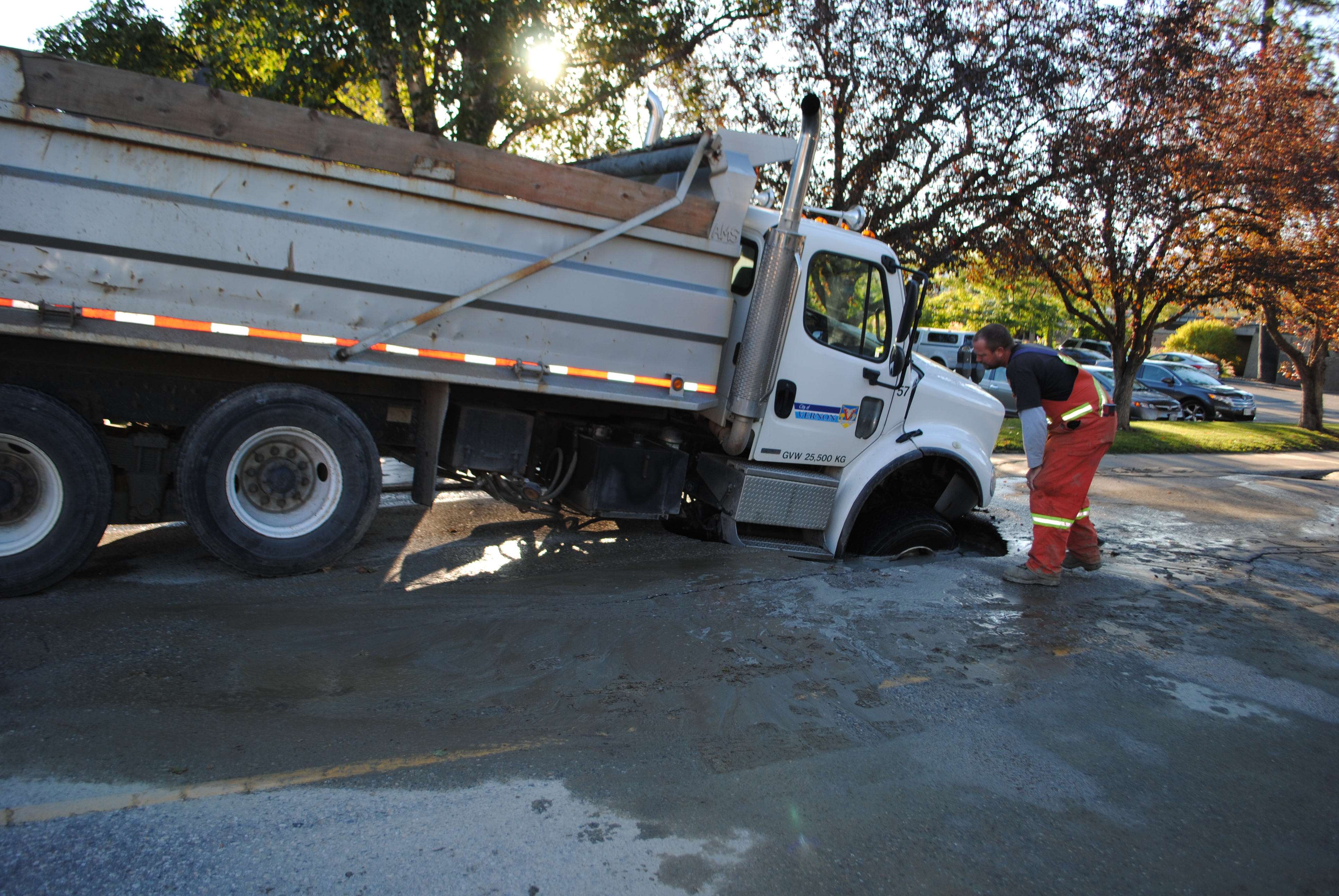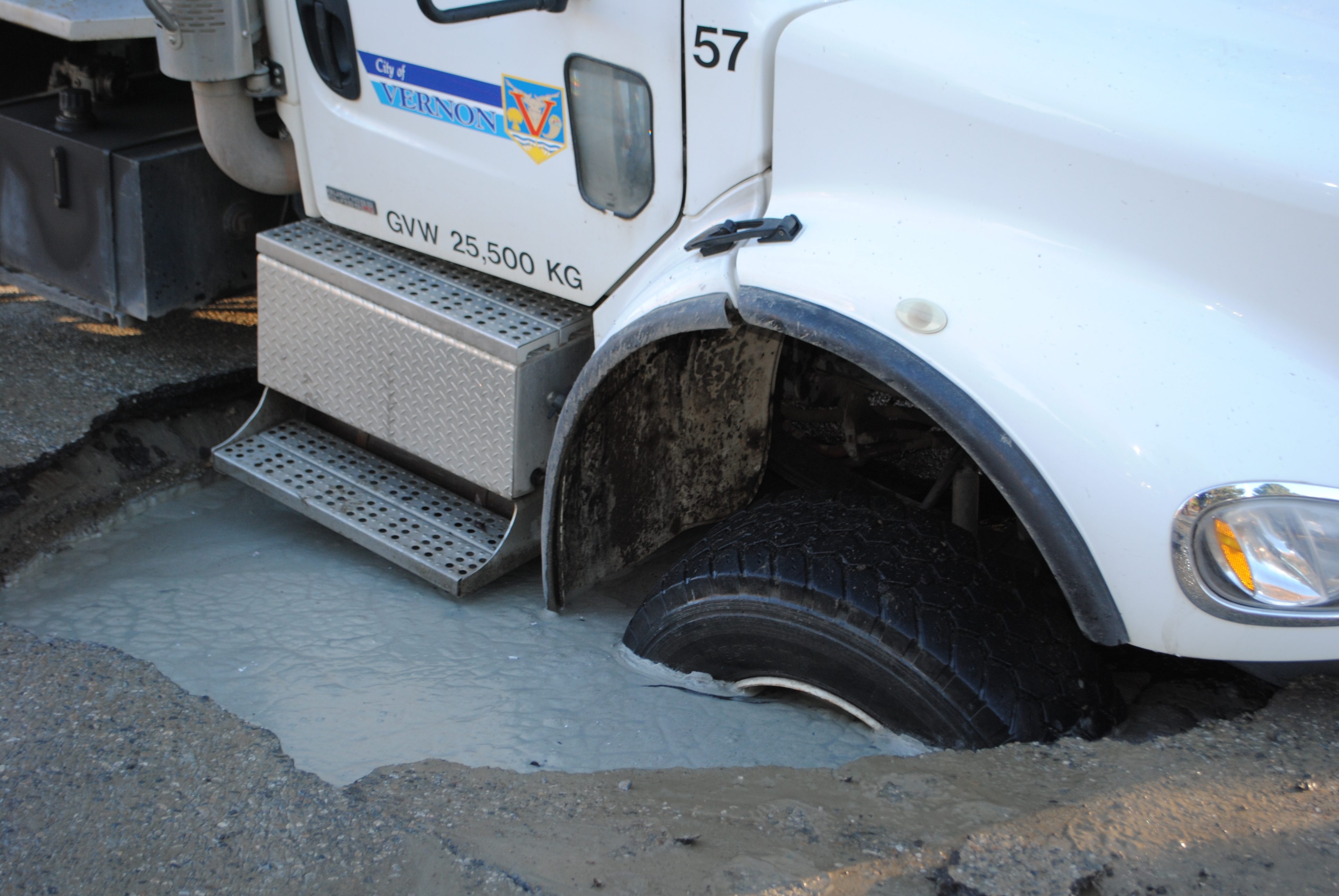 Unfortunately when crews arrived to start repairs one of their dump trucks broke through the pavement, probably weakened by the water flow.