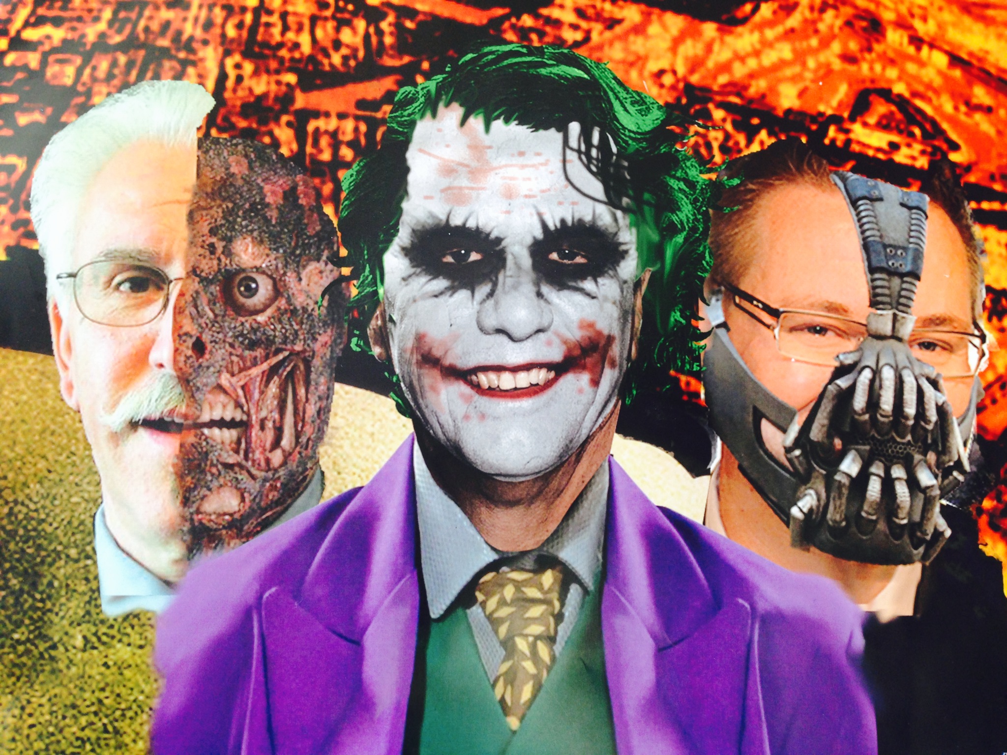 Mayoral candidate John Vassilaki as Two-Face; mayoral candidate Andrew Jakubeit as Bane and the current mayor, Gary Litke as the Joker.