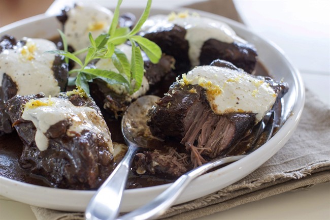 I turned up the heat to simmer and reduce some of the wine, which tamps down its alcoholic edge and concentrates its flavour. Then I added just a few cups of chicken broth. Admittedly, this doesn’t seem like much liquid for all those short ribs. But one of the advantages of a slow cooker – compared to a Dutch oven or any kind of similar pot in which you’d braise something in an oven – is that none of the liquid escapes or evaporates. On the contrary, any of the liquid produced as the ingredients cook is going to accumulate in the pot. That’s why, when using a slow cooker, you want to cut in half the amount of liquid you add to an oven-braised or stew recipe. Otherwise, you’ll end up with a bland and watery sauce.