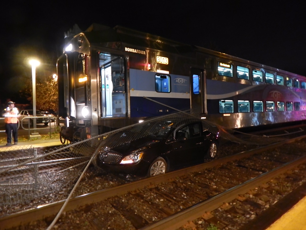 Just before 7 p.m. the motorist was driving on 3rd Ave. in Terrasse-Vaudreuil when she somehow got stuck between two closed railway crossing barriers, just as an AMT train was approaching.