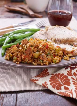 This fragrant and flavourful stuffing variation is sure to become a holiday favourite. Served as a side or as a dressing with your favourite meat, this recipe combines savoury chorizo, sweet red pepper and nutty whole-grain brown rice.