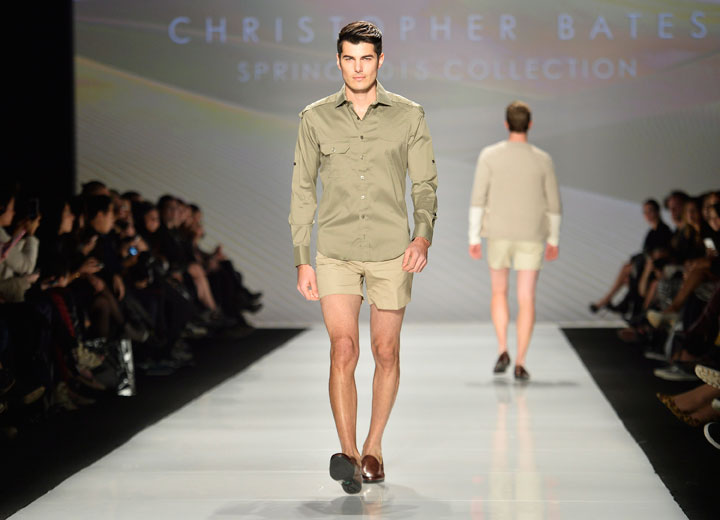 Bates presented a more tailored, refined approach to safari-inspired style with khaki button-down shirts, shorts, camouflage-printed trousers and cargo pants, as well as luxe outerwear offerings such as a textured tan blazer and crisp khaki trench.