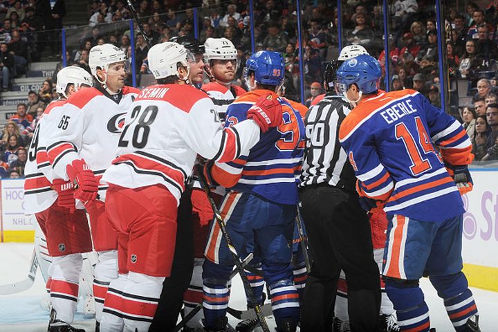 Edmonton moved ahead once more four-and-a-half minutes into the third period with a power-play goal as Eberle used Hall as a screen before beating Khubodin glove-side with a slap shot. Carolina complained that there should have been a penalty on the play to Edmonton’s Benoit Pouliot after breaking his stick on a slash of Hurricane defender Brett Bellemore, who then turned the puck over to Eberle.