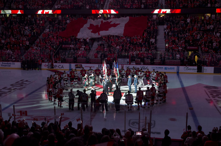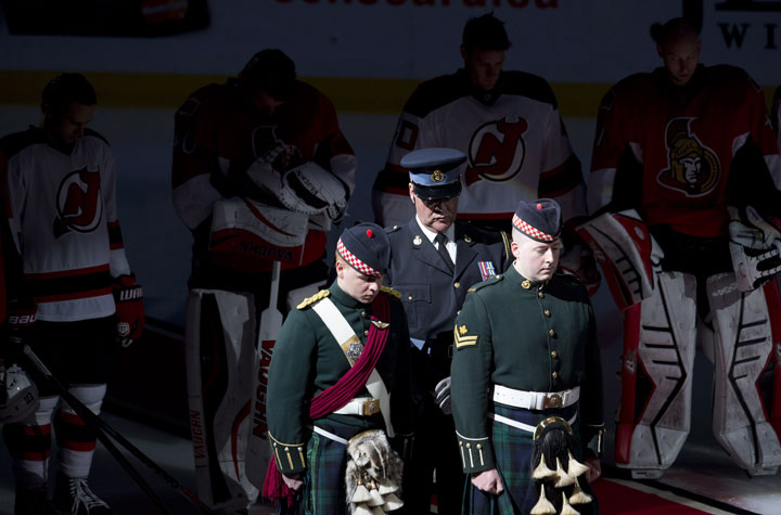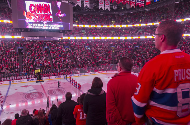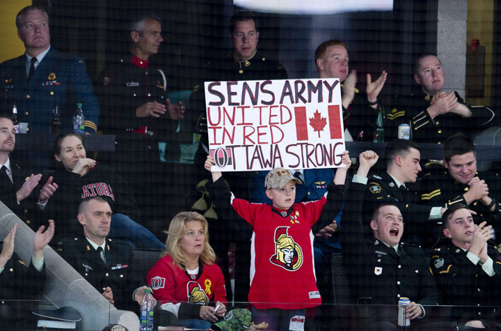 “Hockey Night In Canada” opened the proceedings with a video montage featuring scenes from Ottawa, including the National War Memorial. References to Prime Minister Stephen Harper’s Thursday speech to Parliament gave way to the message that Canadians “unite around this game because we always unite around the game.”