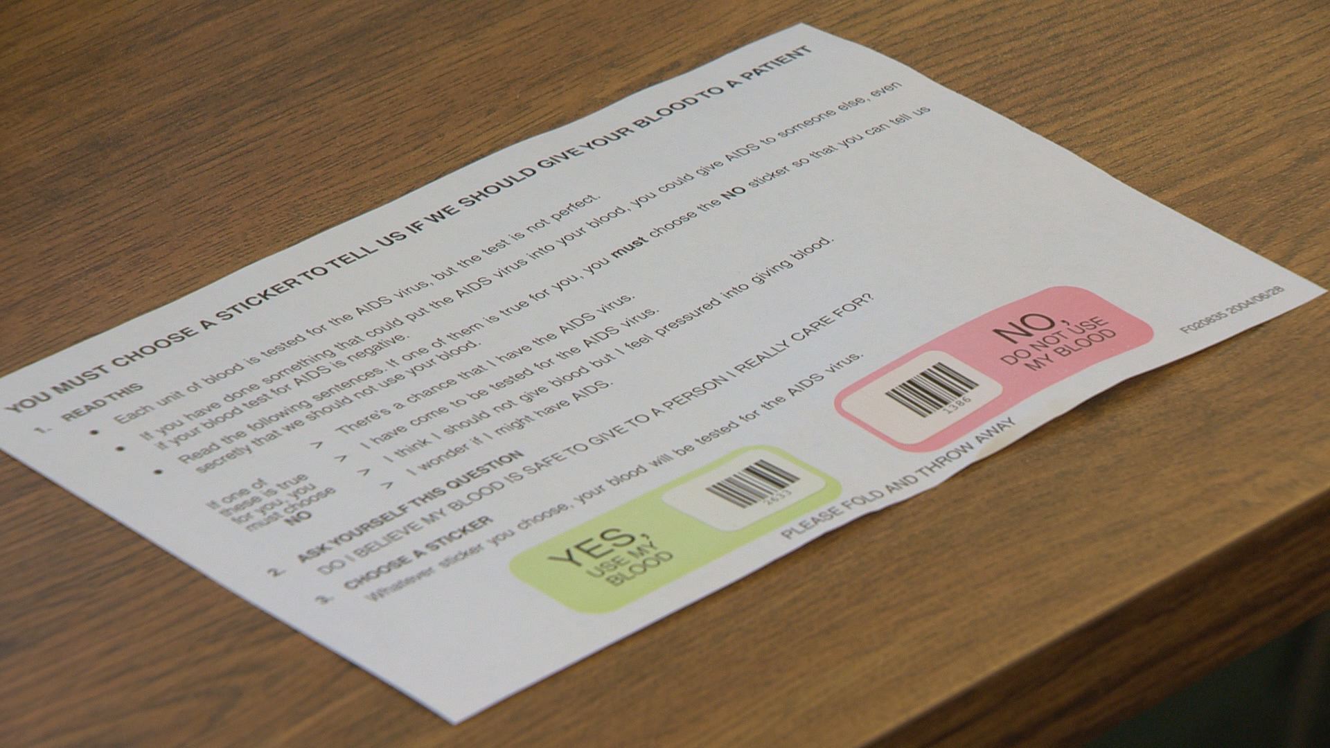 The form includes two barcoded stickers: one on the “Yes, use my blood” section and one on the “No, do not use my blood” section. Alone in a screening room, donors removed one sticker and attach it to their blood screening form and toss the CUE form in a box, then donate.