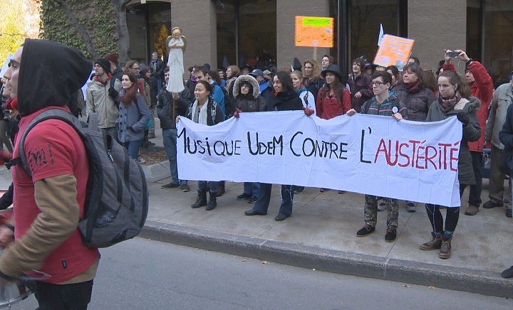 Protesters met outside the Premier’s office at the corner of Sherbrooke street and McGill College to object the Liberal government’s plan to cut $3 billion from the provincial budget.