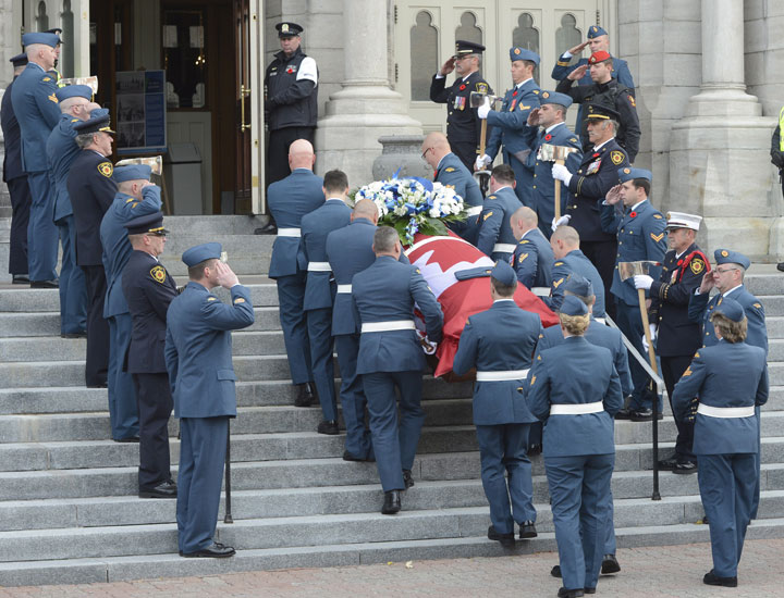 It was loaded into a hearse as three Canadian Forces helicopters flew overhead, a nod to Vincent’s work as a member of a helicopter squadron.