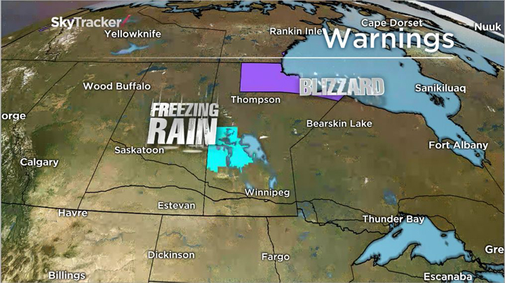 WINNIPEG – Northern Manitoba is under a weather warning as a cold front brings miserable weather into the province Friday.