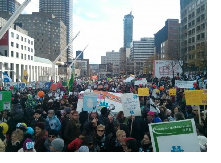 MONTREAL — Thousands of people gathered at Place des Festivals to protest a law proposed by the provincial Liberal government to index the cost of daycare to household income.