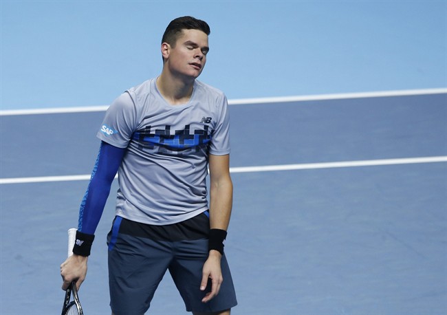 LONDON – Canadian Milos Raonic withdrew Thursday from his final group match at the ATP Finals in London after suffering a leg muscle tear in a loss this week to Andy Murray.