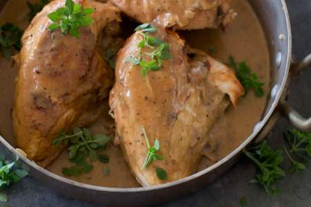 MADEIRA-BRAISED CHICKEN WITH MUSHROOM GRAVY