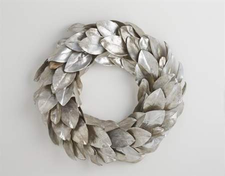 Crate & Barrel has a pretty wreath made of silver-painted magnolia leaves that would work in both traditional and contemporary homes. Another is made of rolled paper and twigs to create a swirl of texture that taps the rustic trend.