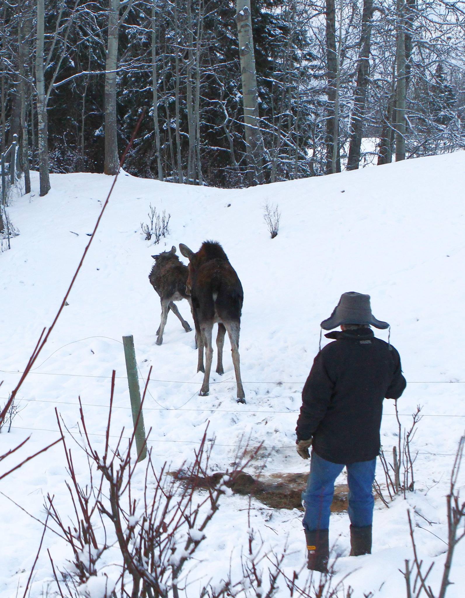 One of the volunteers at the shelter had gone for a walk and had called the Langens about the calf. However, when he was on the phone with them the moose started moving.