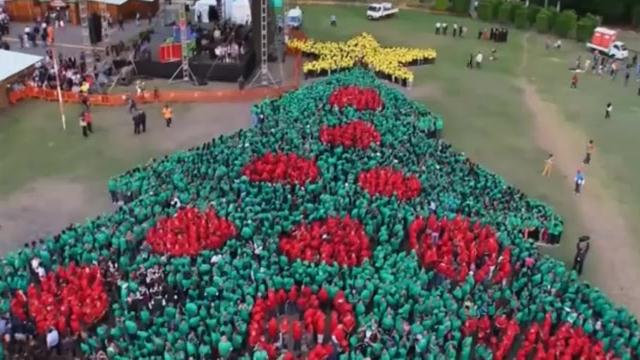 Nearly three-thousand people gathered outside the national palace and made the shape of a giant Christmas tree, including people in yellow shirts to form a star and red shirts for the tree‘s ornaments.